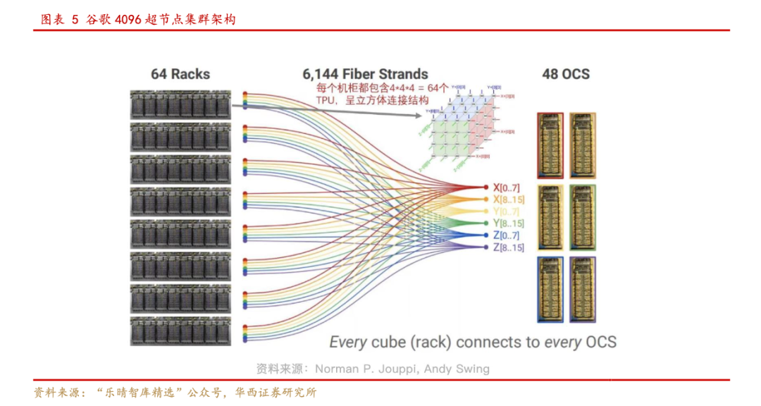 当前全球主要厂商中,谷歌和Lumentum以MEMS方案为主。谷歌2023年就在Jupiter数据中心网络中大量引入了OCS。在TPUv4代际中也引入了OCS技术,已规模部署。对于谷歌 TPUv4 的系统而言,64 个机柜(每个机柜包含 64 个 TPU,集群内总共 4096个 TPU)连接到 48 台 OCS,相当于 OCS 与 TPU 的数量比例是 3/256。