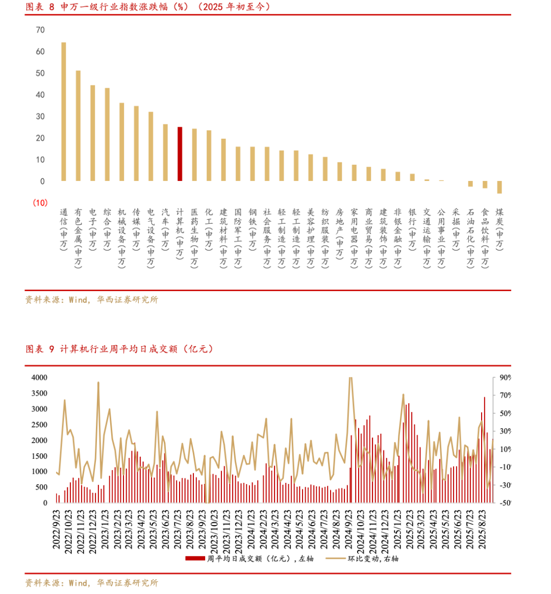 2025年初至今申万计算机行业涨幅在申万一级31个行业中排名第9名。年初至今申万计算机行业累计上涨24.97%,在申万一级31个行业中排名第9位,沪深300上升14.41%,高于指数10.57个百分点。