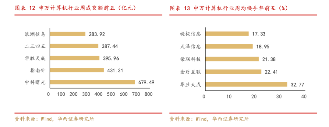 从周成交额的角度来看,中科曙光、指南针、华胜天成、二三四五、浪潮信息位列前五。从周换手率的角度来看,华胜天成、金财互联、荣联科技(维权)、天泽信息、旋极信息位列前五。