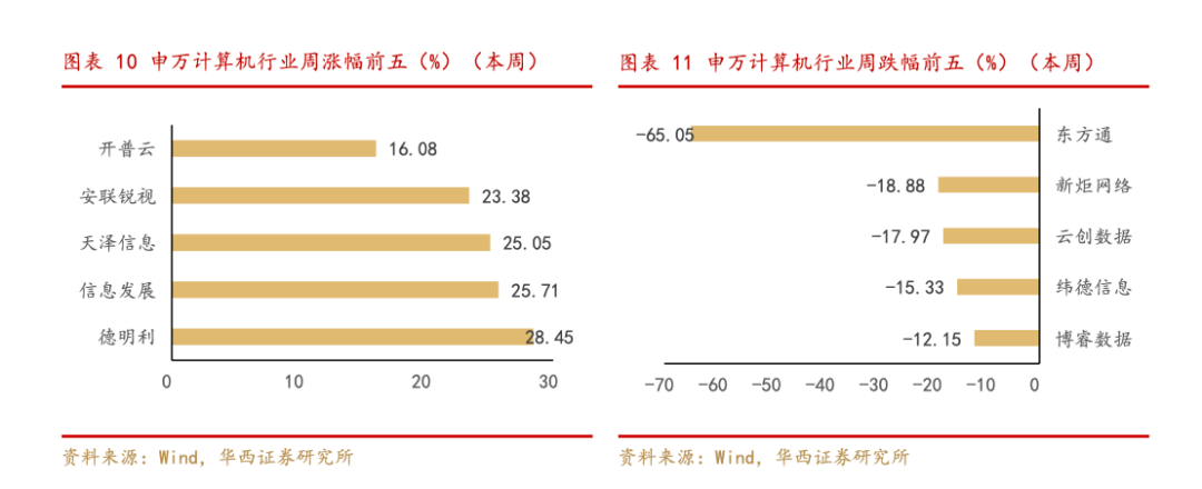 本周计算机板块下跌。321只个股中,80只个股上涨,228只个股下跌,13只个股持平。上涨股票数占比24.92%,下跌股票数占比71.03%。行业涨幅前五的公司分别为: 德明利、信息发展、天泽信息、安联锐视、开普云。跌幅前五的公司分别为:东方通、新炬网络、云创数据、纬德信息、博睿数据。