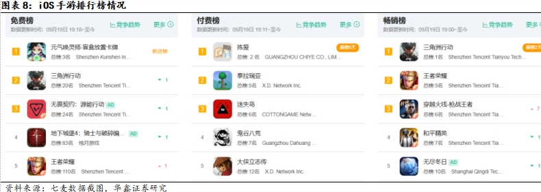手机游戏方面,排行榜情况如下所示,免费榜排名前三的手游为《元气唤灵师·盲盒放置卡牌》、《三角洲行动》和《无畏契约:源能行动》,畅销榜排名前三的手游分别为《三角洲行动》和《王者荣耀》、《穿越火线-枪战王者》。