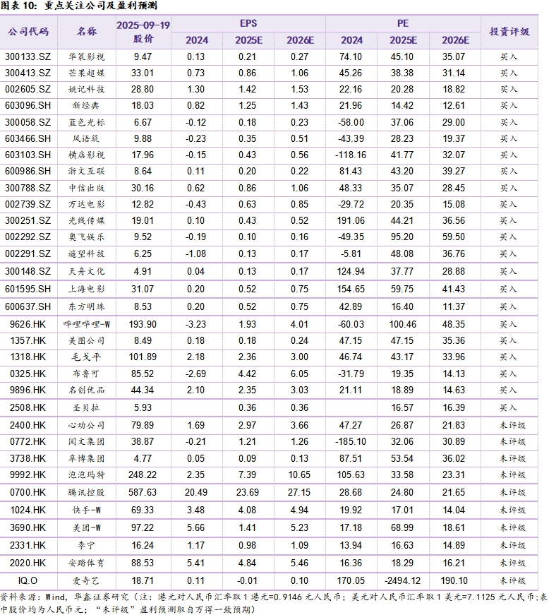 个股跟踪:A股可关注,东方明珠600637(作为国有文化传媒集团排头兵,AI时代有望开启增长新引擎,开启东方有线超高清AI升级行动,通过股权投资方式受让超聚变数字技术有限公司股权);芒果超媒300413(新综艺《声鸣远扬》9月海选并将有望10月底开启直播,与智元机器人合作联合研发“小玖”机器人并用于节目中);蓝色光标300058(ALL In AI战略见成效,战略投资PureblueAI清蓝,共同发力GEO市场,预计2025年年化AI驱动收入将实现30-50亿元,从ARR角度进行PS估值,有望带来市值增厚);万达电影002739(暑假档后将迎国庆档关注影片《浪浪人生》,非票收入通过创新拉动创收,万达电影IP售卖业务还储备《疯狂动物城》系列IP、初音未来、《小马宝莉》系列IP等);汤姆猫300459(《汤姆猫总动员2》成汤姆猫海外新晋主力产品,关注后续AI新品供给,同时数字营销业务也有望受益字节跳动产业链);奥飞娱乐002292(2025年9月推出员工持股计划受让价格为4.84元/股,看后续毛绒品类拓展,也将受益AI+陪伴赛道);中信出版300788(央企,大众阅读头部企业主业持续具韧性,夸父AI数智出版平台持续提质增效,IP运营与内容生态构建加速,IP相关图书如《哪吒·三界往事》《黑神话·悟空》《影神图》等);华策影视300133(国庆档关注电影《刺杀小说家2》,受益广电21条政策,布局算力已初见成效,投资加码短剧外,积极布局AI,间接投资智谱华章);姚记科技002605(看后续主业修复回暖进展,关注卡牌板块热度拉动情绪);天舟文化300148(教辅与游戏双主业业绩增长,新业务AI+教育可期,2025年7月推出AI练字教育产品);上海电影601595(电影《浪浪山小妖怪》拉动周边衍生品热销,也将受益IP+文旅赋能消费新场景);横店影视603103(关注国庆档进展,下沉市场内需仍具潜力,市占率仍具提升空间,借力横店的影视产业资源,加强文旅业务融合,推动构建影视产业生态新发展);;风语筑603466(作为数字展示龙头,风语筑正借EPCO模式强化品牌科技文化影响力,加速拓展数字文旅新场景打造体验经济;2025年7月打造的文旅在水一方科幻馆有望成为行业标杆文化新品,以具身智能驱动新文旅,借科幻赛道转战体验经济:携手三体宇宙,以“P+科技+商业”EPCO模式打造“体·未来学院”);浙文互联600986(全链路AI布局再迎发展新机遇,深耕“AI+营销”“AI+文化”“算力+融租”三大产业链,全面推动人工智能从技术研发向场景应用与产业落地转化,着力构建“技术-场景-产业”全链路闭环生态);港股可关注,B站9626(已开启双十一招商预热,2025年业绩有望持续向好,以优质内容为支点也是创越周期的核心,社区视频商业价值有望再升);腾讯0700(2025年8月新游《无畏契约:源能行动》表现优异,关注AI驱动内容进展);阿里9988(迎阿里云栖大会,推出高德扫街榜,加码AI与消费,以AI为支点撬动时代红利);阜博集团3738(作为全球领先的数字内容保护与交易服务提供商,香港发布条例,阜博集团以数字内容收益开拓RWA新路径作);美图1357(推出AI Agent产品RoboNeo,将进一步以AI技术打造世界级的产品,更好去服务生活场景与生产力产品用户的垂直需求);布鲁可0325(关注后续新品进展);圣贝拉2508(以女性为支点撬动产后护理和修复市场,小红书的另一种表达,2025年上半年业绩增长向好,关注后续出海与AI的进展);名创优品9896(大店战略进展顺利,期待海外增量);毛戈平1318(10月将正式进驻香港海港城,持续期待公司海外拓展)。