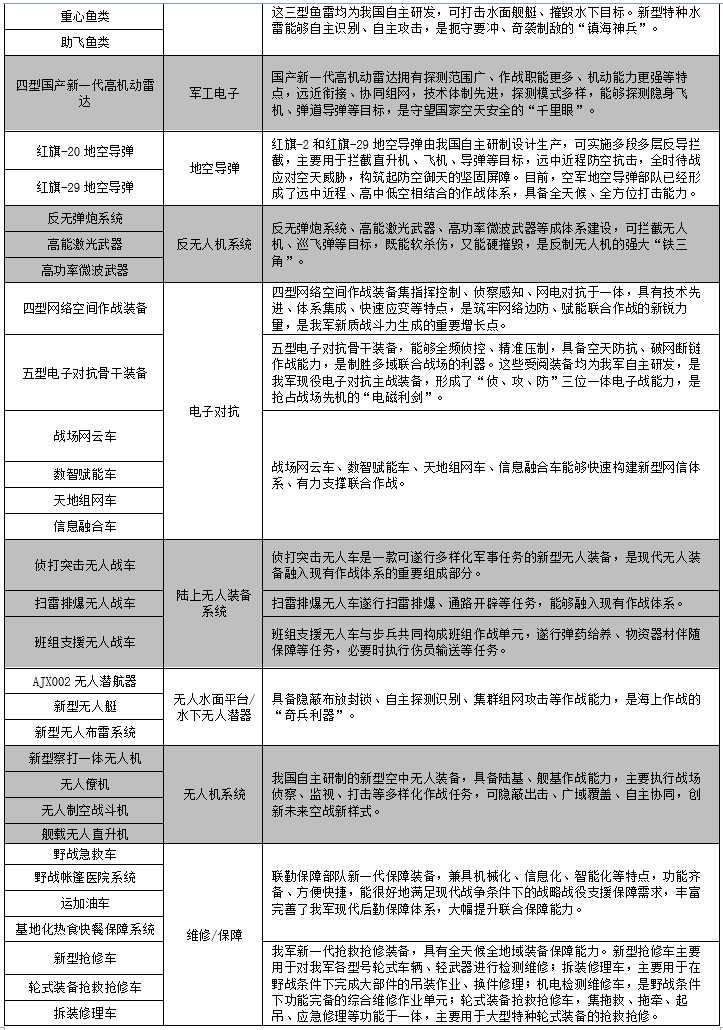 ① 以新型四代装备为主体,例如新型坦克、舰载机、歼击机等,按作战模块进行编组,展示我军体系作战能力。