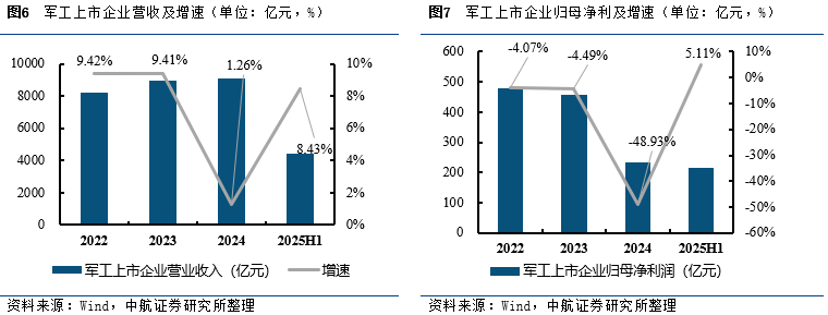 2025年上半年军工上市公司(中航证券军工股票池)共计243家,实现营业收入(4405.48亿元,+8.43%),归母净利润(214.16亿元,+5.11%)。2024年,行业需求结构调整、政策变化、价格调整等诸多因素的影响,军工行业基本面承压较为明显,盈利能力出现阶段性下滑。