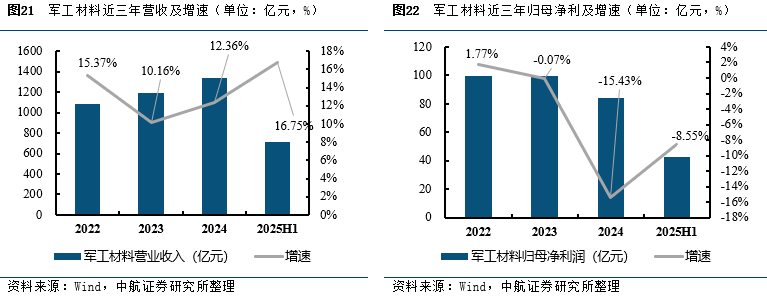 2025年上半年军工上市公司军工材料板块合计实现营业收入(713.05亿元,+16.75%),归母净利润(42.98亿元,-8.55%)。军工材料随下游需求出现较为明显分化,航空发动机相关材料如高温合金等承压相对较大。