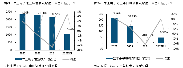 2025年上半年军工上市公司军工电子板块合计实现营业收入(1058.43亿元,+7.02%),归母净利润(47.82亿元,+0.34%)。军工电子企业较多为军民两用企业,营收利润中除了军工行业外,同时面向半导体、新能源汽车等,具备较好的抗风险能力;同时在军事智能化浪潮中,军工电子需求将有望进一步增加。