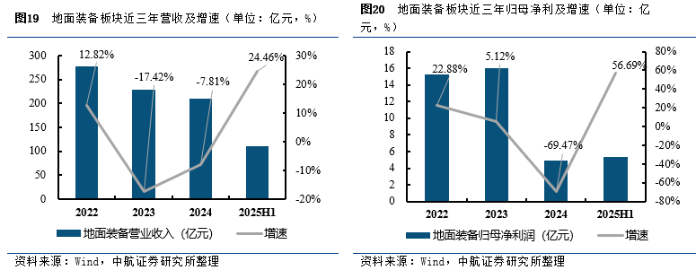 2025年上半年军工上市公司地面装备板块合计实现营业收入(110.33亿元,+24.46%),归母净利润(5.34亿元,+56.69%)。