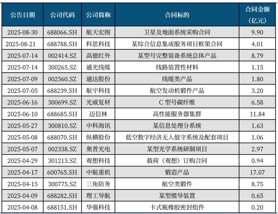 2025年以来,多家航空航天领域中上游上市公司公告了重大合同或中标通知书,具体如下表所示。