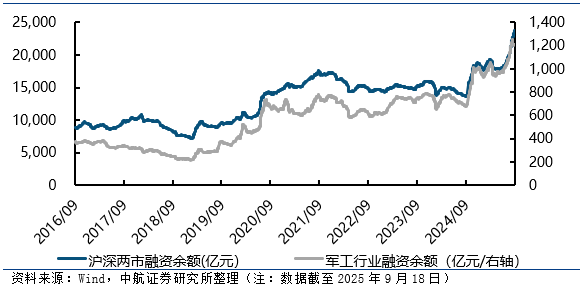 截至2025年9月18日,军工行业的融资余额合计1212.73亿元,比上周环比上升0.08%,占两市融资余额比例为5.10%。