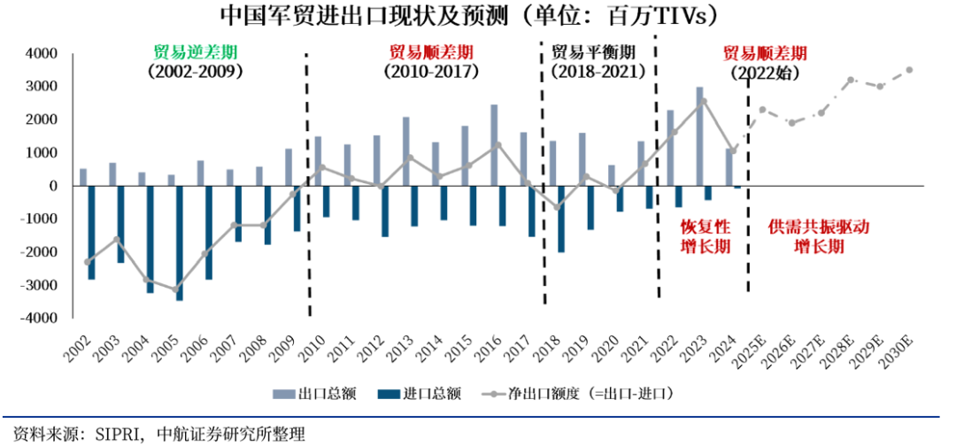 最近两年来,随着国际局势的波云诡谲,俄罗斯等传统军贸大国的出口缩减,同时受益于我国国防科技工业体系的完善和国产替代能力的提升,我国军贸出口量显著增长,带动净出口额显著提升。我国或将进入下一个贸易顺差期。