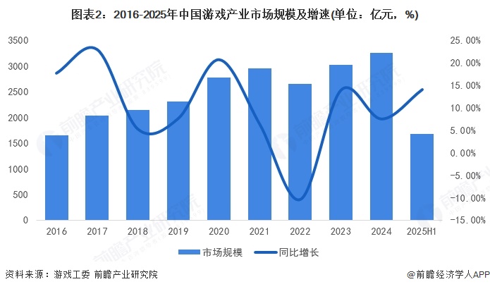 根据游戏工委数据表明,2024年我国游戏产业市场规模已经突破3257.8亿元,同比增长7.53%,约占全球游戏市场的26.7%。2020-2022年我国游戏行业出现短暂下滑,从2020年正增长20.71%到2022年负增长10.33%,出现自2008年以来的首次负增长。但2022年后我国游戏市场规模迅速反弹,年增速达7%以上,至2025上半年我国游戏市场规模为1680亿元,同比增长14.08%。