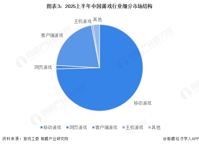 根据游戏工委数据表明,2025上半年我国游戏行业细分市场结构中移动游戏占比超过70%,居全游戏细分市场实际销售收入首位,其次是客户端游戏占比为21%。
