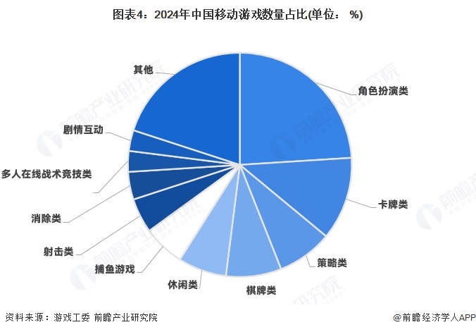 从数量上看,2024年在收入排名前100的移动游戏产品中,角色扮演类居首位,占比达24%,同比下降7%。卡牌类居次,占比12%,同比2023年上升一位。策略和棋牌类占比均为8%。需要留意的是,2023年占比第四的射击类游戏,2024年大幅降至第七位。