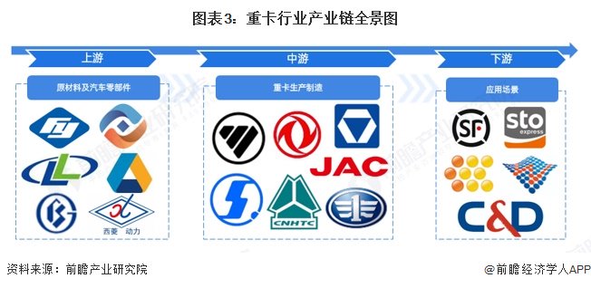 重卡行业产业链上游包括汽车玻璃、车用金属、车用塑料以及汽车零部件等,中游为重卡整车生产制造,下游为重卡产品应用场景,包括工程运输、卡车租赁、物流运输等。