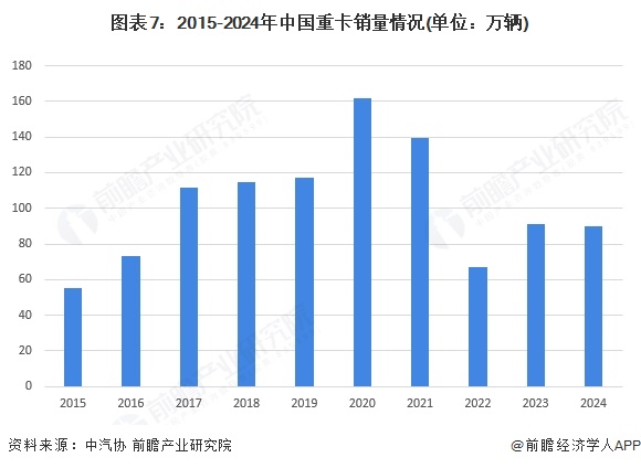 2015-2020年,中国重卡销量稳呈现先增长后波动下降的趋势,2020年重卡销量达到高峰,全年销量超过160万辆,2015-2020年的增长主要是由于中国逐步推进国三至国六排放标准升级,尤其是 2019 年国六标准的实施,直接推动存量车辆大规模更新。自2021年开始中国重卡销量整体回落,这是由于国六标准全面实施后,市场提前透支了未来3-5年的换购需求,整体需求相对下滑。2024年中国重卡销量约为89.9万辆