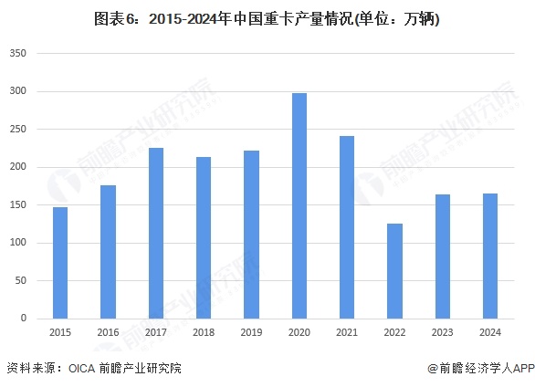 2015-2024年,我国重卡产量变动呈现波动态势,2015-2020年重卡产量整体增长,2020达到297.65万辆,2021年开始中国卡车产量波动下降,2024年重卡产量为165.59万辆。