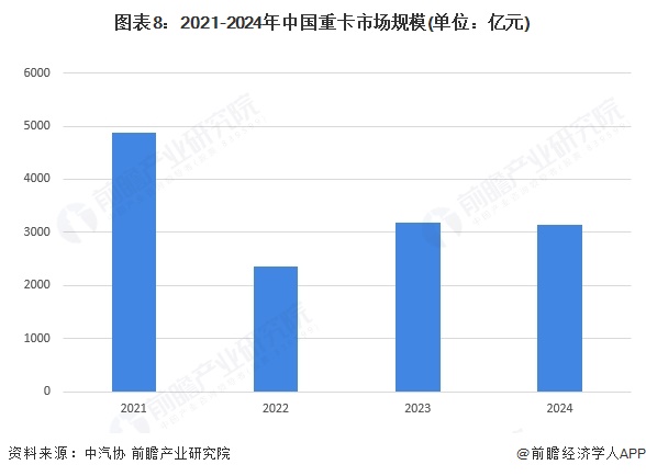 据了解,重卡的平均价格在30万元-40万元每台区间,假设按35万元/台进行测算,2024年中国重卡市场规模约为3147亿元。