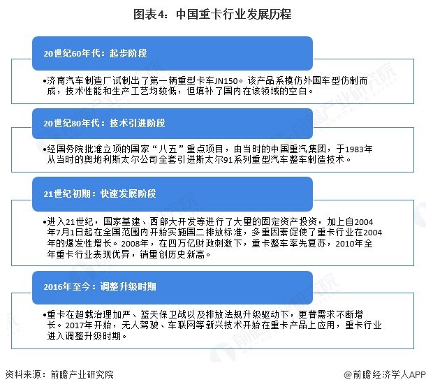 进入21世纪,国家基建、西部大开发等进行了大量的固定资产投资,加上自2004年7月1日起在全国范围内开始实施国二排放标准,多重因素促使了重卡行业在2004年的爆发性增长。2015年后,重卡在超载治理加严、蓝天保卫战以及排放法规升级驱动下,更替需求不断增长。2017年开始,无人驾驶、车联网等新兴技术开始在重卡产品上应用,重卡行业进入调整升级时期。