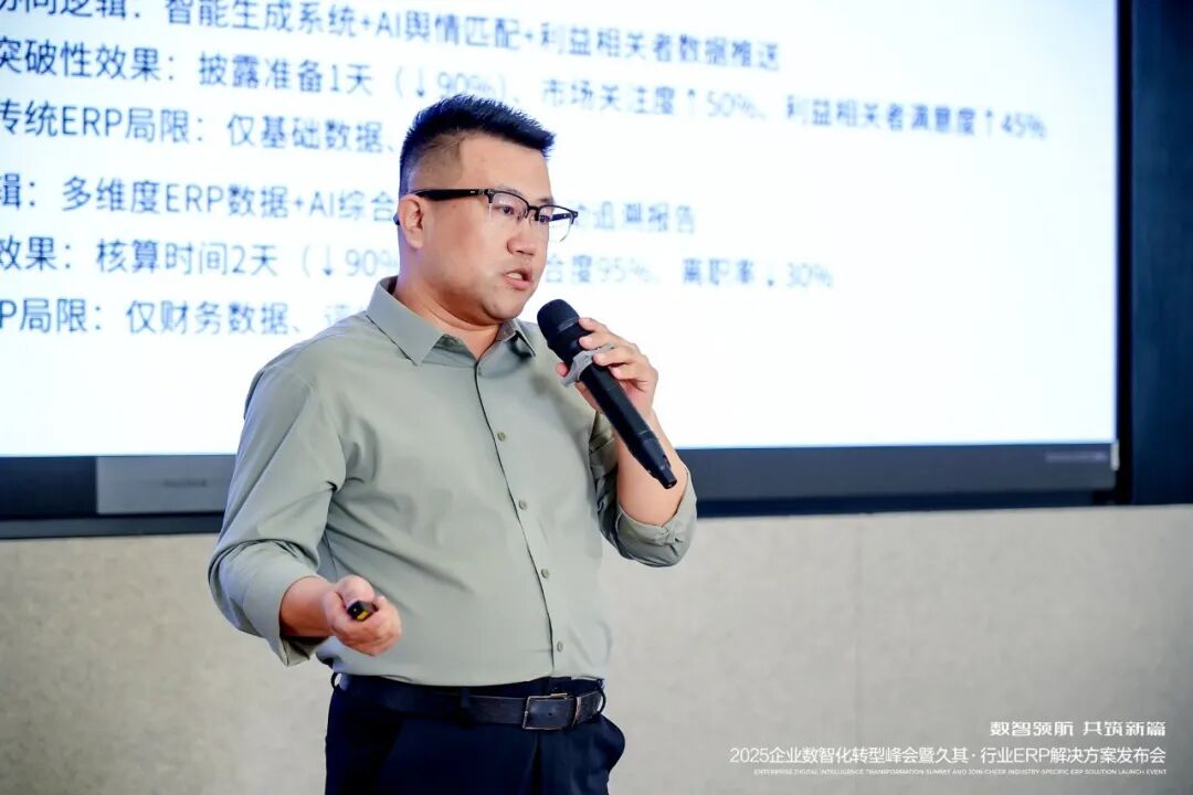 在《久其行业ERP解决方案》白皮书发布仪式后,财政部管理会计咨询专家、久其软件解决方案总监 史瑞超 进一步解读了白皮书的优势与核心价值:相较于通用型ERP,其以“行业Know-how+AI赋能”为特色,搭配久其女娲GPT实现智能问数、自动报表生成;同时“云原生+信创适配”特性,可满足企业不同发展阶段需求。