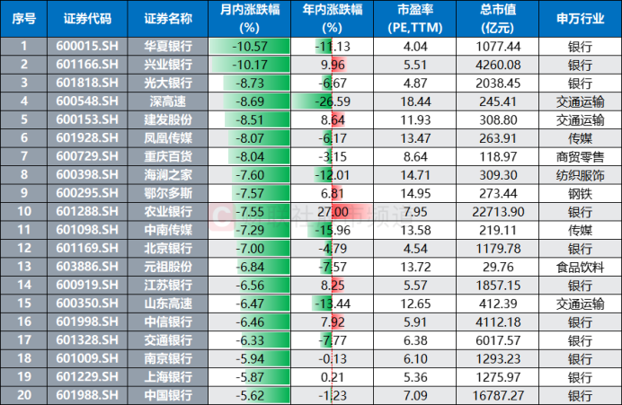 从其成分股上看,累计共有12股本月以来跌幅超7%,占整个成分股近24%比例。其中,华夏银行、兴业银行本月跌幅双双超10%,光大银行、深高速、建发股份、凤凰传媒、重庆百货等股月内也跌幅明显。若统计前十大权重成分股,仅有潞安环能、中谷物流2股月内收涨,涨幅分别达15.2%、6.8%,兴业银行、海澜之家、农业银行等股则跌幅居前。