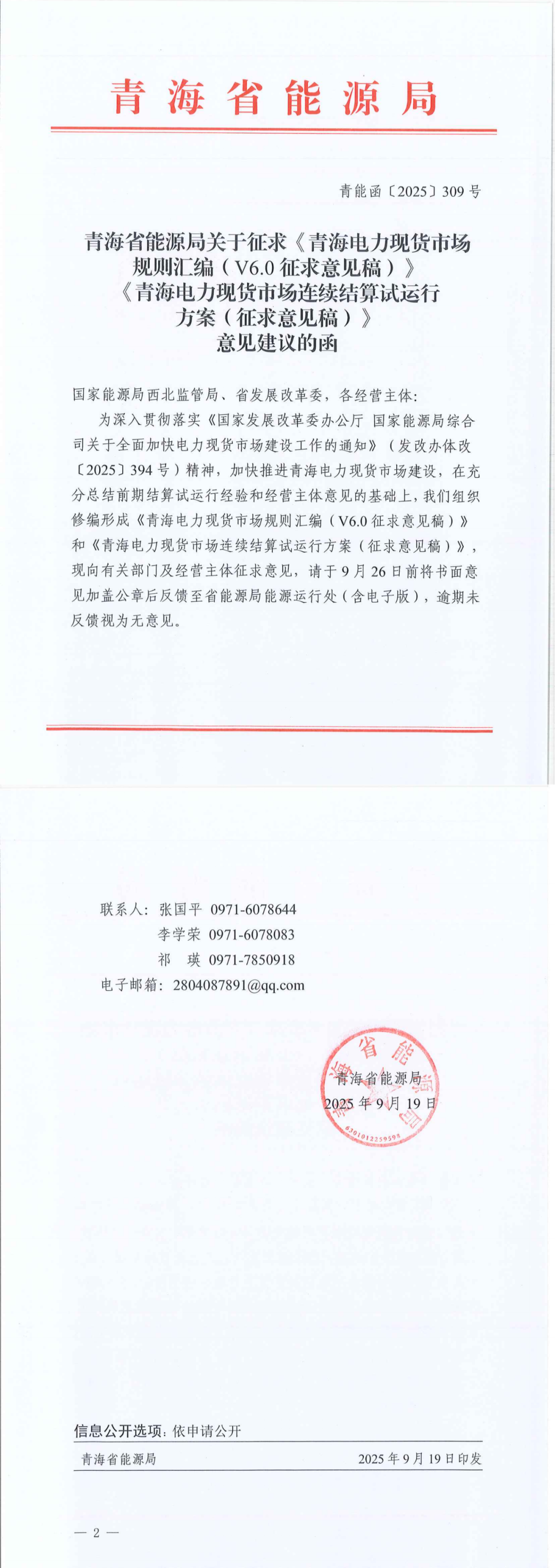 其中文件包含《青海电力现货市场连续结算试运行方案(征求意见稿)》和《青海电力现货市场规则汇编(V6.0征求意见稿)》。