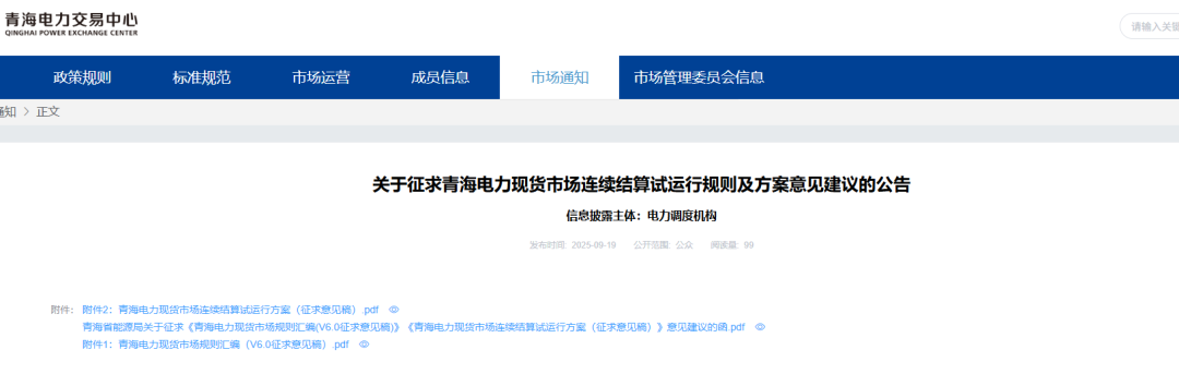 储能与电力市场获悉,9月19日,青海电力交易中心发布关于征求青海电力现货市场连续结算试运行规则及方案意见建议的公告。
