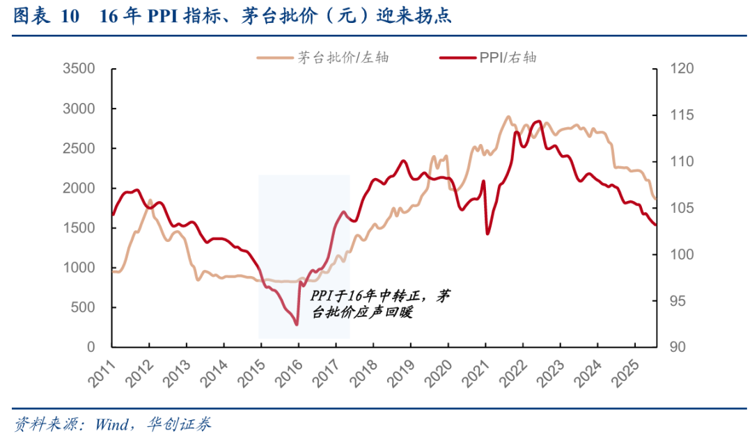 16年中宏观价格指标上行,行业正式行至右侧。16年春节后白酒在二季度批价有所回落,行业仍有“反弹还是反转”的分歧。对于消费品投资,16年最重要的宏观变化是年中PPI指标转正,当白酒行业周期与宏观价格周期共振后,茅台批价于16年下半年正式从800元一路上行,并于16年底站上千元,头部酒企利润表也开启好转,正式标志行业周期步入右侧。