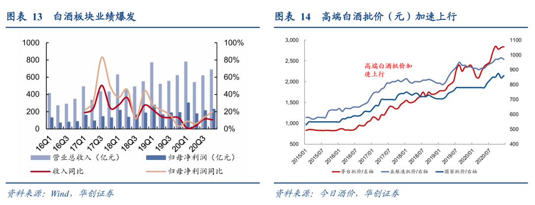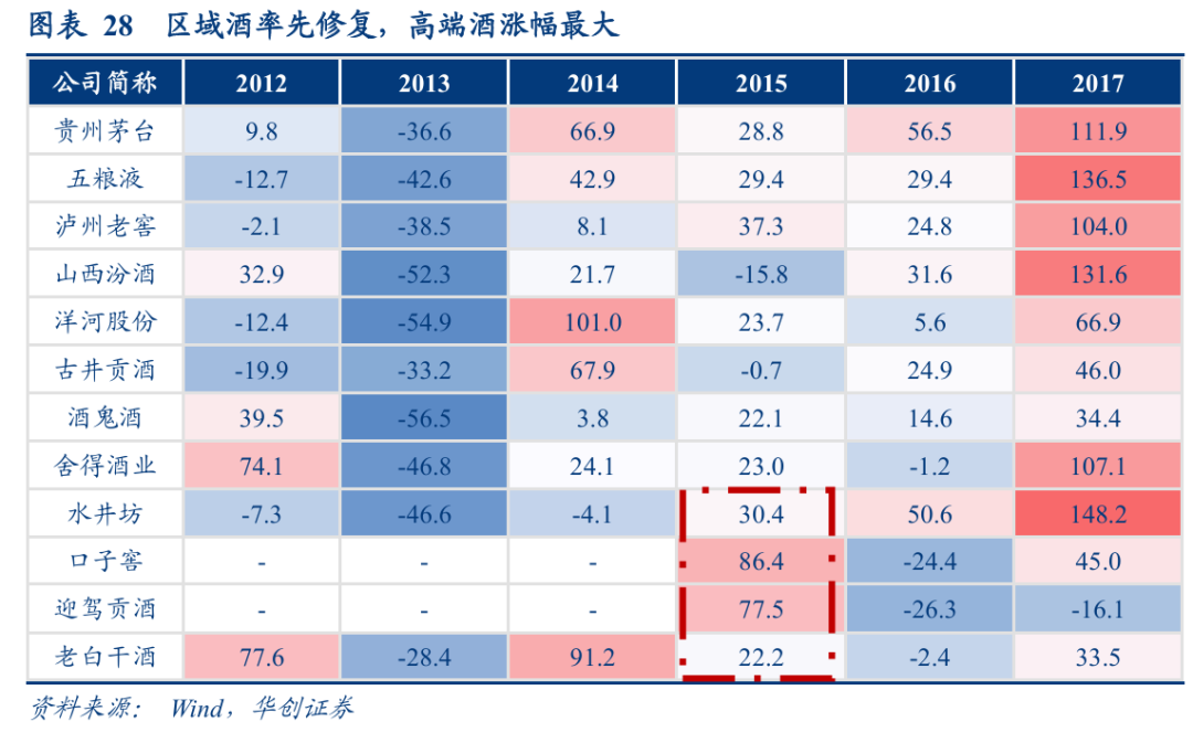 15年,基本面筑底,牛市中涨幅滞后,改制催化的老白干和次新股口子窖和迎驾贡酒涨幅居前。15年中老酒批价回升(新酒价格筑底),茅台连续两年低个位数增长目标后,预期筑底完成,板块在牛市中涨幅滞后,其中改制催化的老白干和次新股口子窖和迎驾贡酒在当年涨幅突出。