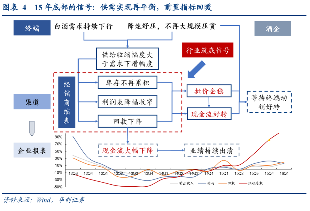 15年白酒供需基本实现再平衡。尽管需求仍未见好转,但在供给侧持续减压后,供给收缩幅度已对冲需求下滑幅度;其次渠道端缩表,体现为给酒企打款支持下降、库存不再累积、经销商虽未盈利但现金流好转。因此行业供需再平衡已开始实现,飞天批价在800元底部持续盘整,不再继续下跌。同时,周期底部两个前瞻观察信号已经开始出现,一是老酒价格率先回升,二是头部酒企现金流提升回暖。