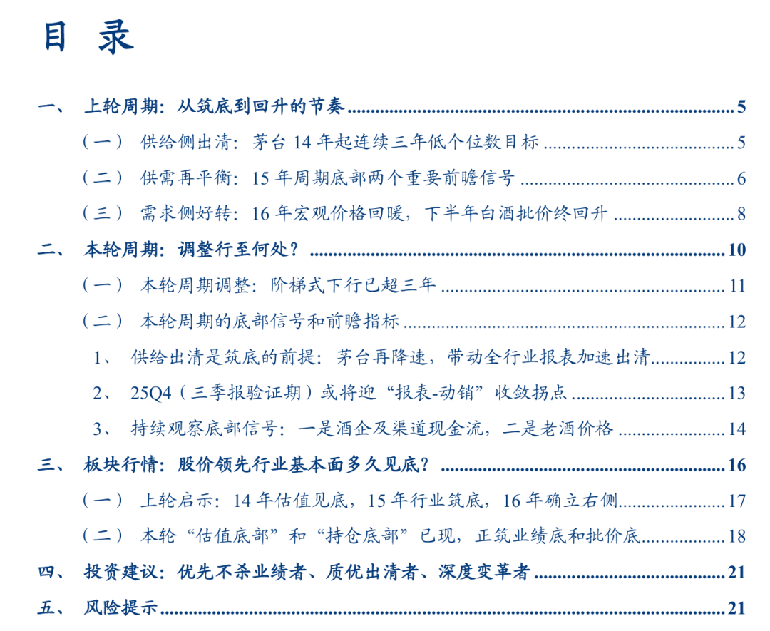 前言:本轮白酒周期经历自22年来三年持续调整,供需压力从渠道受损传导至酒企报表受损,对本轮周期筑底时点和节奏,市场各方仍各执一词。在我们6月行业专题报告《白酒:雾锁千嶂破,目向星河开》基础上,本文通过复盘上轮周期13-16年出清-底部-回升节奏,聚焦分析本轮白酒周期筑底节奏及周期底部前瞻信号,围绕三大核心问题进行深度探讨: