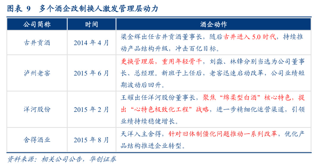 此外还需指出的是,数家酒企更换管理层,国企壮士断腕式改革。酒企经营方面,管理层改制换人意味着酒企于困境中主动寻求突破,打破原有体制约束,重新焕发组织活力,提高企业治理与运营效率,推动品牌经营持续向上,为后续释放经营弹性奠定基础。15年多个酒企通过改制换人重启管理周期,其中上一轮调整幅度最大的酒企老窖于15年6月更换管理层,刘淼和林锋组合接任董事长和总经理,公司开启彻底变革,也标志着加速出清探底。