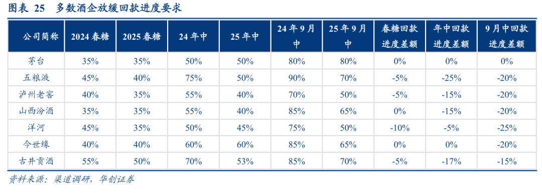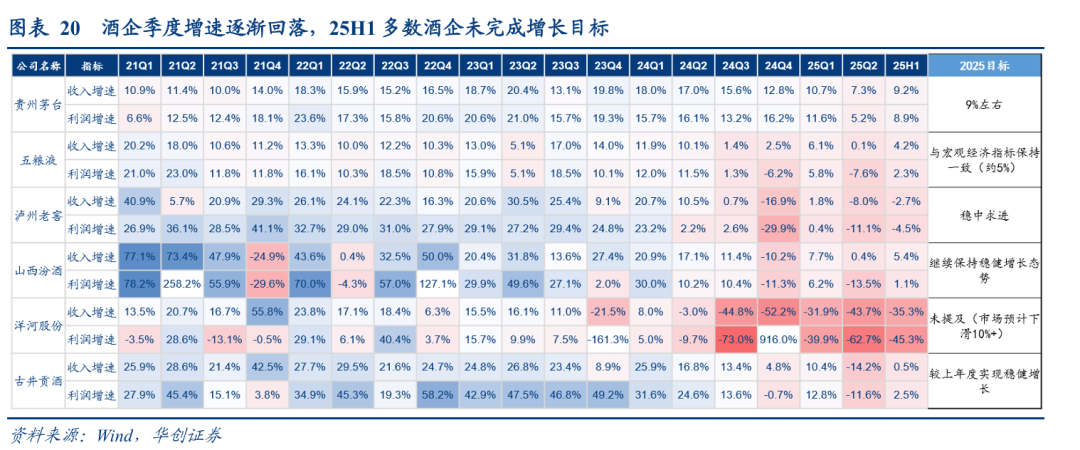 “与茅台对标机制”影响五泸汾等全国化酒企出清节奏,三季度起或是加速出清期。茅台龙头效应以及国企考核对标机制,头部酒企25H1风险出清仍不充分,我们认为一旦龙头茅台降低目标,也是其他酒企抓住报表压力释放、供给出清的窗口,大多数酒企在个别季度将出现大幅下滑,加速行业筑底。