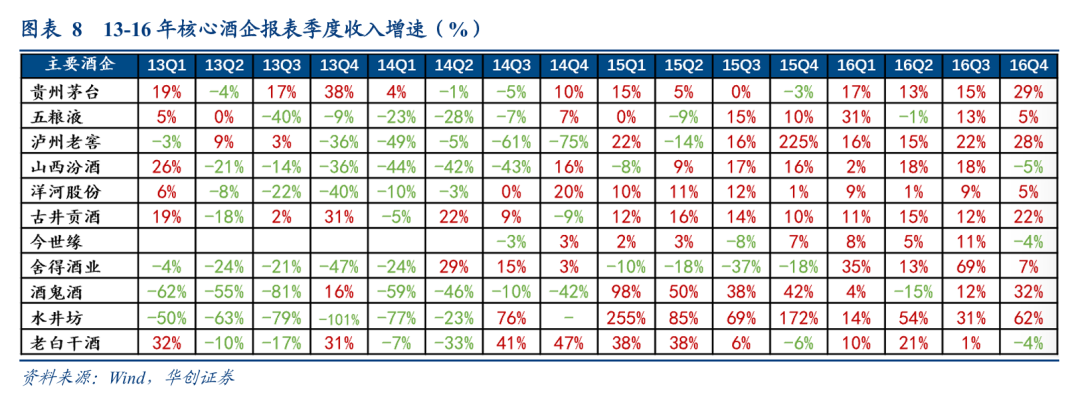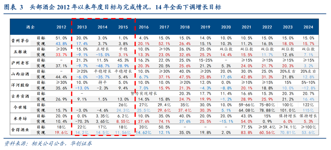 14年全行业供给侧全面调整。除茅台之外,其他头部酒企也于14-15年全面调低报表目标,五粮液14-15年分别定调“正增长”和“平稳”、洋河14年目标“持平”、汾酒14-15年连续两年制定“平稳”目标。