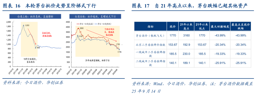 两轮周期调整共性:都经历两个阶段,茅台批价跌幅均过半。第一从阶段来看,衰退都经历两阶段下跌,第一阶段跌渠道利润(22-23年),第二阶段跌厂家利润(24年至今)。第二从茅台批价跌幅来看,上轮从高点1850元附近跌至800+,而本轮从高点至今跌幅已一半(从高点3880到目前1800元附近)。