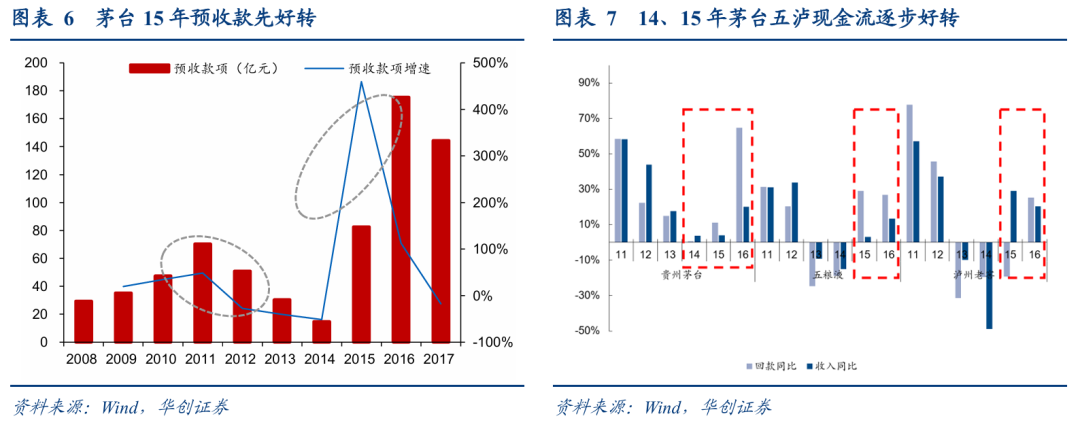 现金流前瞻于利润表,茅五现金流15年已率先好转。酒企报表层面,现金流量表总是先于利润表反映真实经营情况,12年行业现金流已率先恶化,敲响行业调整周期前奏,而15年茅台、五粮液现金流增速率先好转,也同样是周期底部的重要前瞻信号。