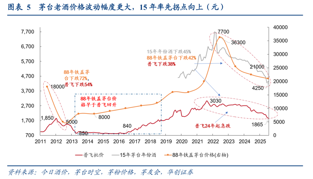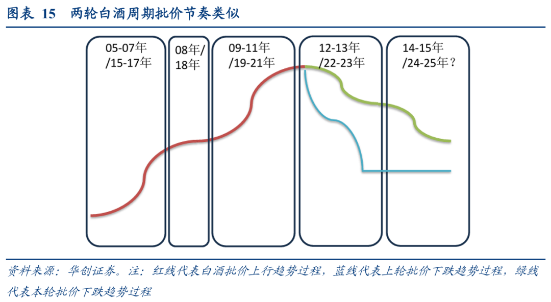 白酒两轮十年周期:时间节奏,传导节奏类似。白酒批价都经历了复苏-繁荣-中继调整-泡沫化-衰退,传导过程都是从茅台开始逐级传导,最后以次高端的地产酒和全国化新名酒的泡沫破裂而结束。05-15年,行业全面繁荣,量价齐升,茅台实现超越,价格高点在2000元附近。15-25年,行业品牌集中,酱香实现超越,茅台价格高点在3600元+。