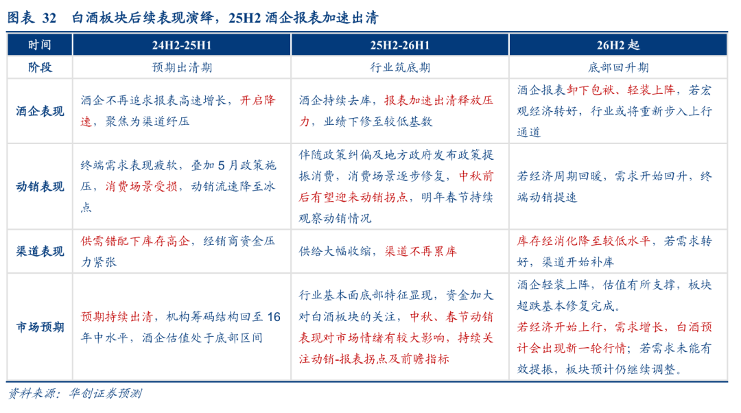 25H2-26H1:行业筑底期,三季报前后预期二阶导转正,有望迎来第一布局点。酒企报表加速出清释放压力,营收/利润增速同比大幅下滑,中秋前后或迎来“报表-动销”拐点。尽管未来四个季度预计将是报表加速出清期,但明年春节持续观察动销-报表拐点及前瞻指标,寻找供需反转确认信号,若春节动销修复超预期,正循环信号将有望进一步确认。