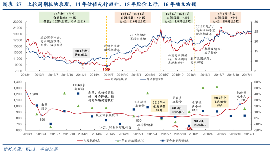 14年,估值与股价率先见底,不杀业绩的酒企实现股价大幅上涨。茅台估值底部8倍PE于14年初确立,而其他酒企于14年中确立,市场预期从不断下调至企稳,深度价值资金已提前布局白酒,没有大幅杀业绩的茅台、洋河、古井当年涨幅分别达67%、101%和68%。