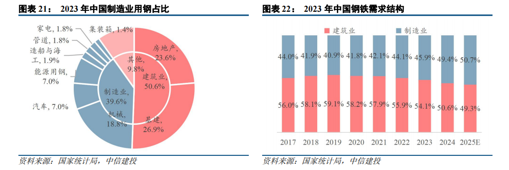 制造业用钢占比已接近50%,成为钢需第一驱动力。细分领域呈现结构性亮点:(1)高端制造突围:新能源汽车、风电、光伏等战略新兴产业保持高增速,拉动特种钢材需求,2025年制造业用钢量预计达4.4亿吨;(2)传统制造企稳:机床、挖机、乘用车等领域维持景气度,其对钢材需求的支撑作用显著。