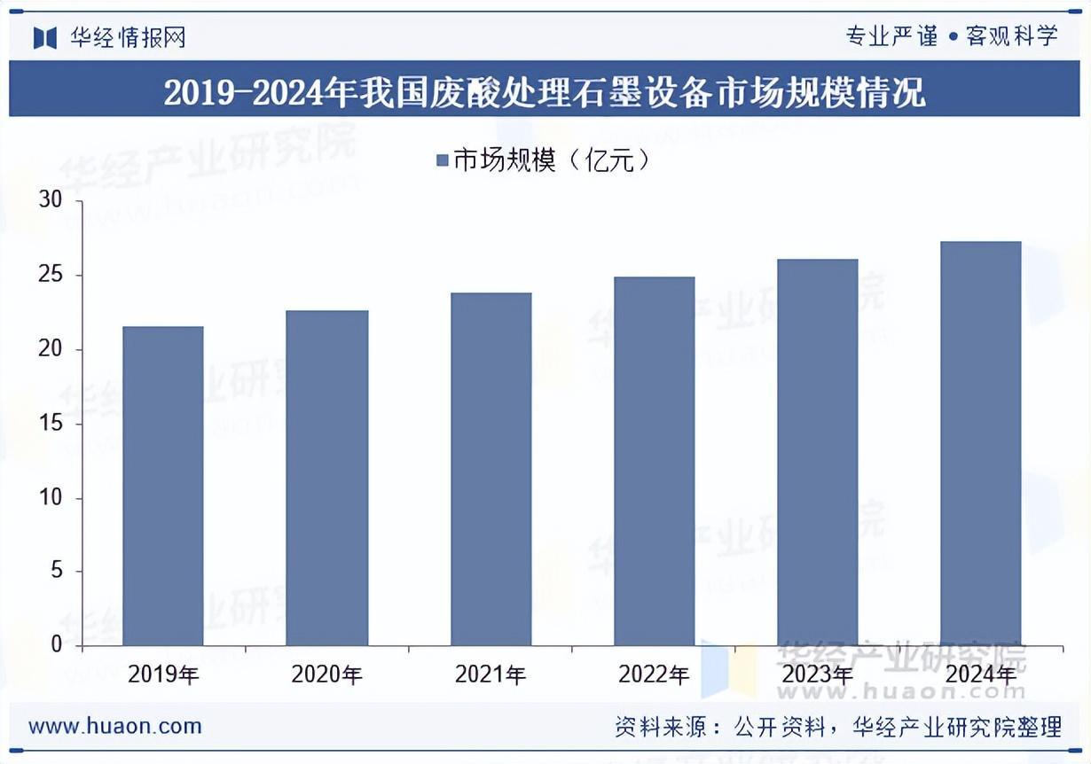 我国之前针对废酸处理大多采用中和法,随着我国环保力度的持续升级,行业逐渐通过解吸、蒸发或者吸收系统进行废酸的处理,因此需要应用到大量的石墨塔器及石墨釜等设备。据统计2024年我国废酸处理石墨设备市场规模达到了27.4亿元,2019-2024年CAGR约为4.9%。