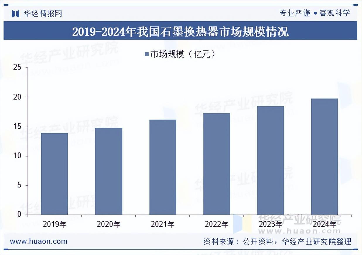石墨换热器是使用石墨制成的传热组件换热器,主要用于盐酸、硫酸、醋酸及磷酸等腐蚀性介质的换热,主要应用于氯碱化工、石油化工、氟化盐、钛白、锆业、氯乙酸、氯化石蜡、单晶硅及氟化工等生产领域。我国是石墨设备市场最大的区域,尤其是化工、新能源等行业的快速增长持续推动了我国石墨换热器需求。据统计2024年我国石墨换热器市场规模达到了19.8亿元,2019-2024年CAGR约为7.3%。