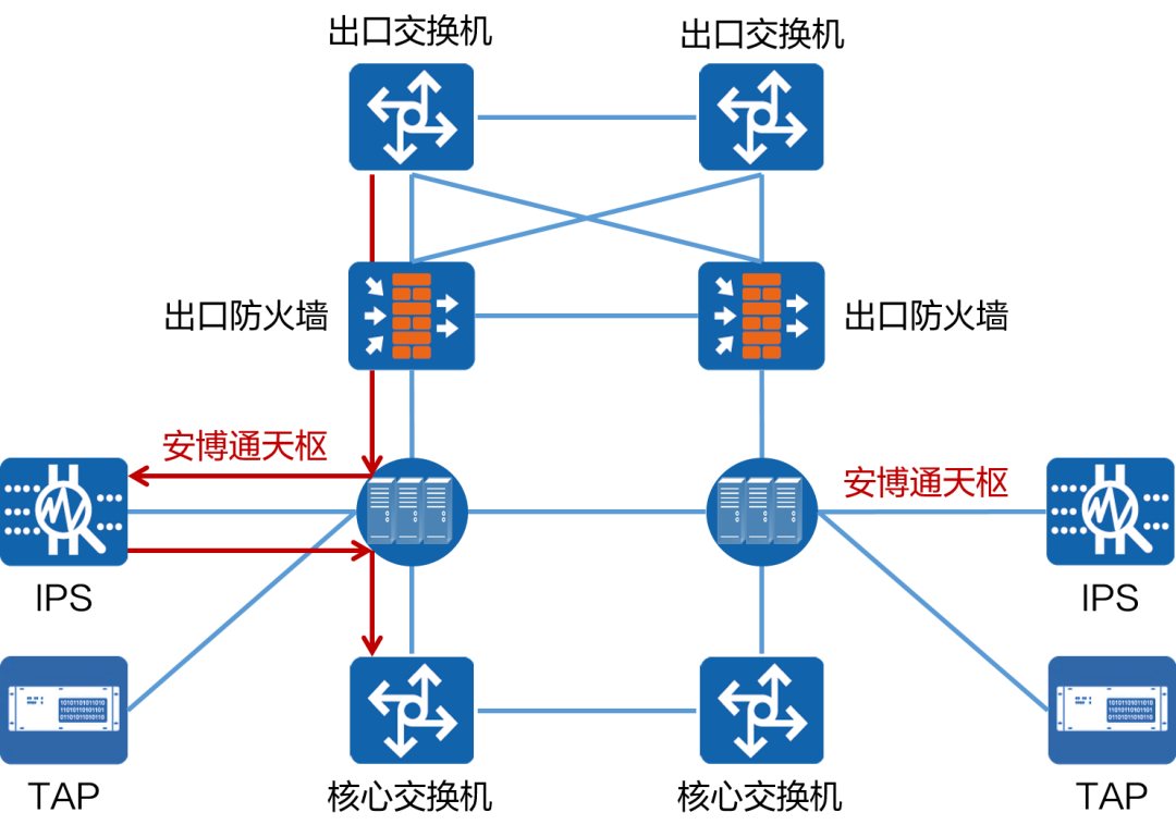 将明文流量调度至IPS进行威胁检测,同步镜像至旁路部署的TAP(分路器),由TAP有序分发给各旁路检测设备,实现多维度、无死角的安全排查。