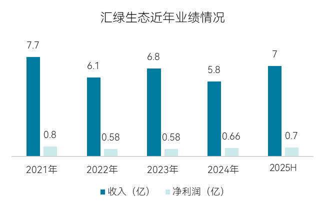 汇绿生态(001267),一家位于武汉的传统生态园林企业,2021年上市,集规划设计、环境修复为一体,专注绿色环保、水生态及环境治理服务。由于众所周知的原因,以园林、修复为主的生态领域近年来发展情况不尽如人意,汇绿生态受到对应影响,业绩自2020年以来,呈现持续下滑趋势,营收从8亿左右下滑到2024年的近6亿,净利润从近9000万,下滑到低点时不足6000万。