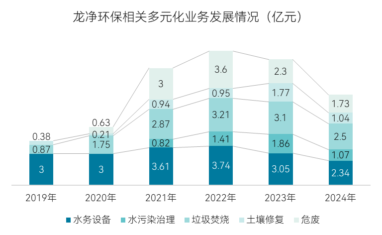 从图中可以看到,即使是当初寄予厚望的水务设备(新大陆环保),营收规模始终在3亿左右徘徊,近年来更是下滑至2亿出头。而危废业务由于市场行情的变化,也只能逐步收缩。相对于百亿营收的龙净环保,找到一个能支撑企业大跨步发展、实现第二增长极的业务确实不易。