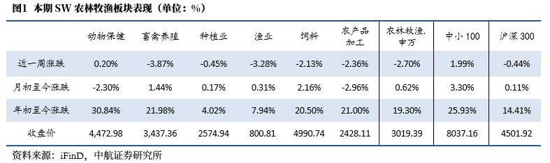 本期(2025.09.14-2025.09.20)上证综指收于3820.09,本期跌1.30%;沪深300指数收于4501.92,本期跌0.44%;本期申万农林牧渔行业指数收于3019.39,本期跌2.70%,在申万31个一级行业板块中涨跌幅排名27位,二级板块动物保健、畜禽养殖、种植业、渔业、饲料、农产品加工的周涨跌幅分别为0.20%、-3.87%、-0.45%、-3.28%、-2.13%、-2.36%