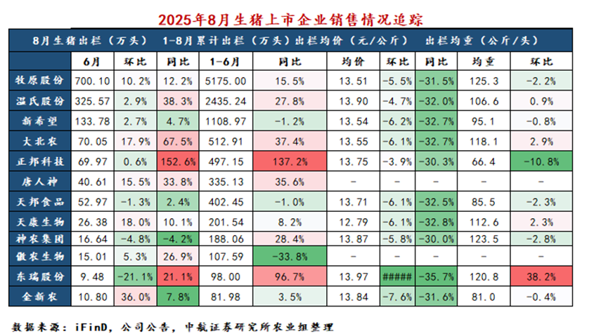 8月猪企销售增加:量上,从已公告12家猪企销售数据看,8月生猪销量共计771.26万头,环比增4.43%。9家猪企月出栏环比上涨,其中,温氏股份、大北农、正邦科技7月出栏环比涨幅38.3%、67.5%,152.6%。价上,8月全国生猪均价有所上升。从已公告12家猪企销售数据看,8月生猪出栏均价为13.72元/公斤,环比跌6.06%。出栏均重上,8月生猪出栏均重有所下降。从已公告12家猪企销售数据看,8月生猪出栏均重为103.5公斤,环比涨2.24%。其中,正邦科技、神农集团8月生猪出栏均重环比降幅10.8%、2.8%。养殖利润上,据iFinD数据,截至09月19日,自繁自养和外购仔猪养殖利润分别为-24.44元/头,-199.31/头。