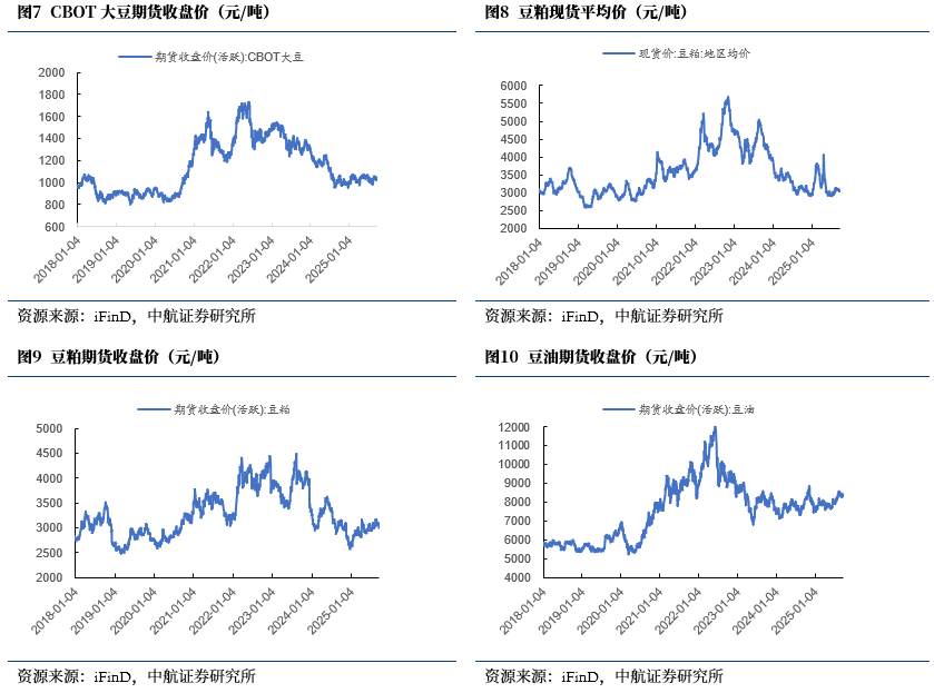 大豆:大豆现货平均价周环比涨0.00%,CBOT大豆期货价格周环比跌0.77%。