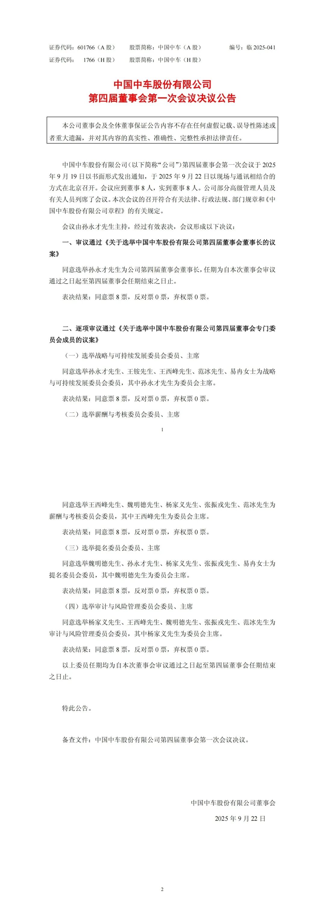 根据中国中车公告内容显示:9月22日,中国中车股份有限公司第四届董事会第一次会议在北京召开,审议通过董事长选举议案,同意孙永才当选公司第四届董事会董事长,任期自本次会议审议通过之日起至第四届董事会任期结束。