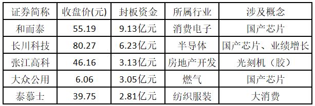 从封板资金来看,今日涨停板个股中,封板资金排名前5的个股包括和而泰、长川科技、张江高科、大众公用、泰慕士。