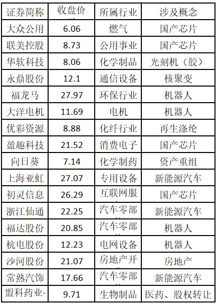 涨停板个股中,股价创出近一年新高的个股有17只(不包括创出历史新高的个股),包括大众公用、联美控股、华软科技、永鼎股份、福龙马、大洋电机、优彩资源、盈趣科技、向日葵、上海亚虹、初灵信息、浙江仙通、福达股份、杭电股份、沙河股份、常熟汽饰、盟科药业-U,具体如下表所示。